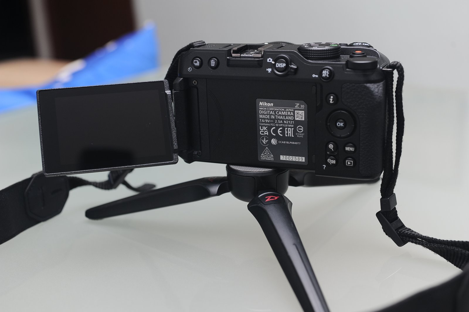 The Z30 has a proper flip out screen where the tripod does not interfere with its usage. Content creators using the screen to check your own framing when shooting yourself will welcome this new screen for sure.